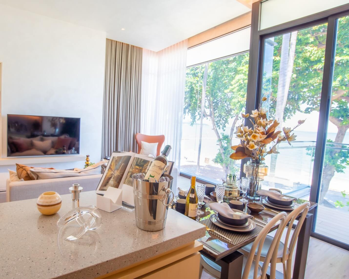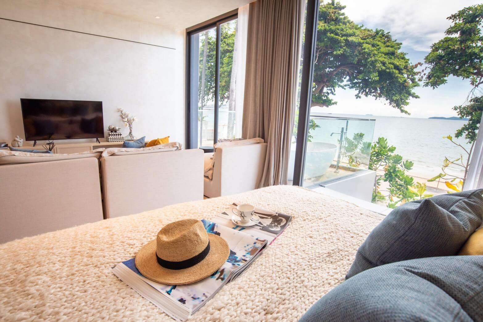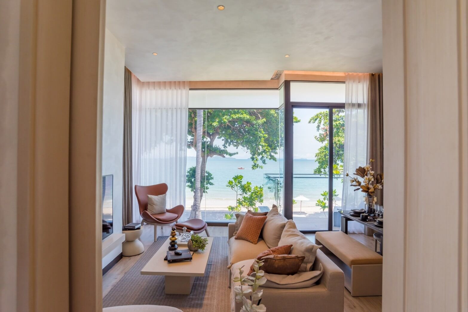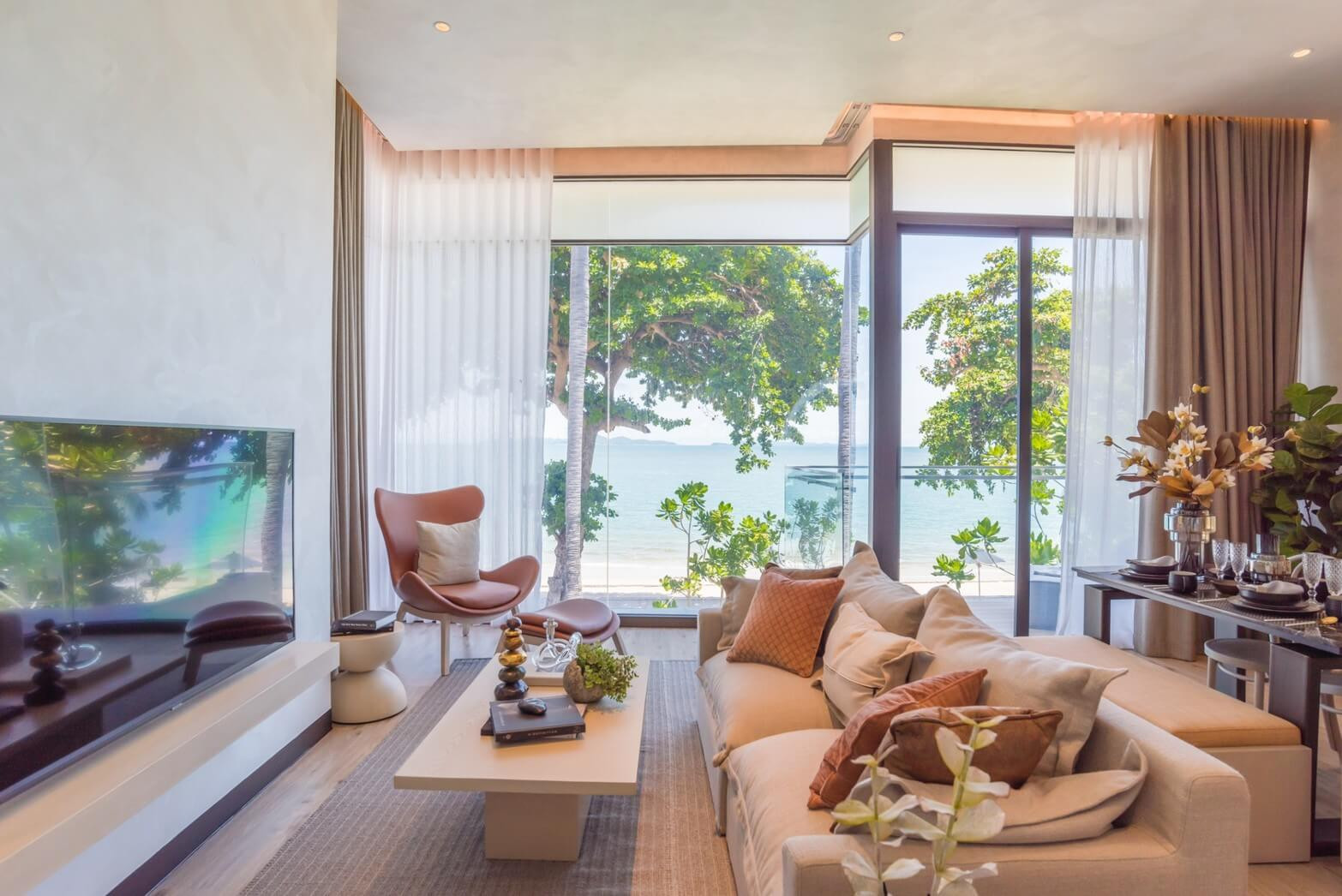 The architecture deserves a closer look. It doesn’t feel rigid. The lines are softer, more fluid, almost wave-like in places, and the glass-heavy design does what it should: brings in light and keeps the Gulf of Thailand in view. Sounds simple. It isn’t. A lot of projects talk about connection to the sea, then give you a narrow balcony and one decent angle. Here, the relationship with the coastline feels much more direct.