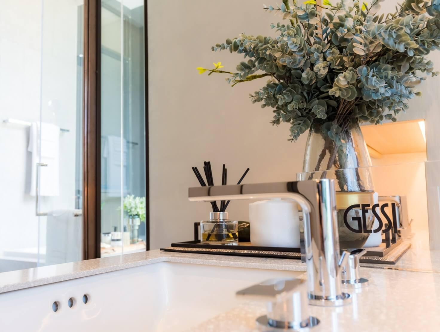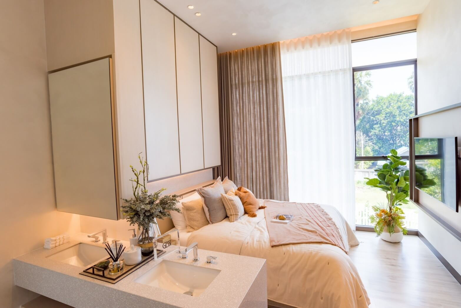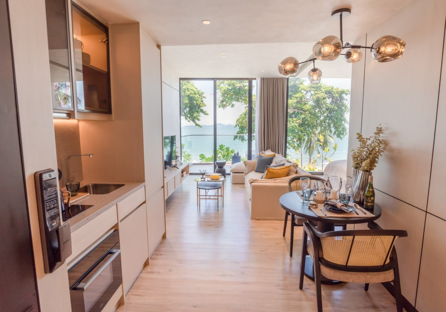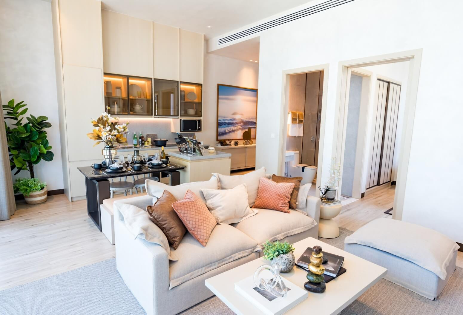 Apartments are ready to move in. The interiors feel light and balanced, with soft neutral tones, warm wood flooring, and full-height glazing that opens toward the sea. Built-in cabinetry blends seamlessly into the walls, while subtle lighting and clean lines create a calm, refined everyday atmosphere.