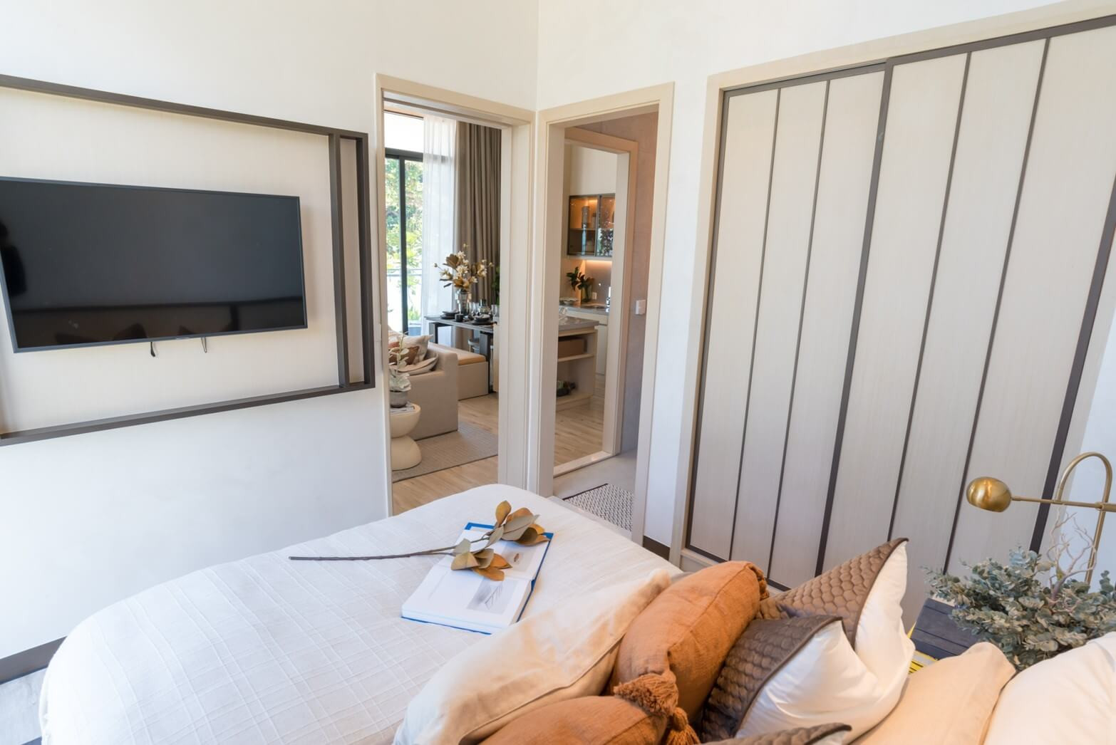 The interiors feature built-in furniture that creates a clean, seamless look. The kitchen is fitted with built-in cabinetry and modern appliances, while living spaces include soft, contemporary furnishings. Bathrooms are equipped with European-standard sanitary ware, ensuring comfort, quality, and refined everyday living.
